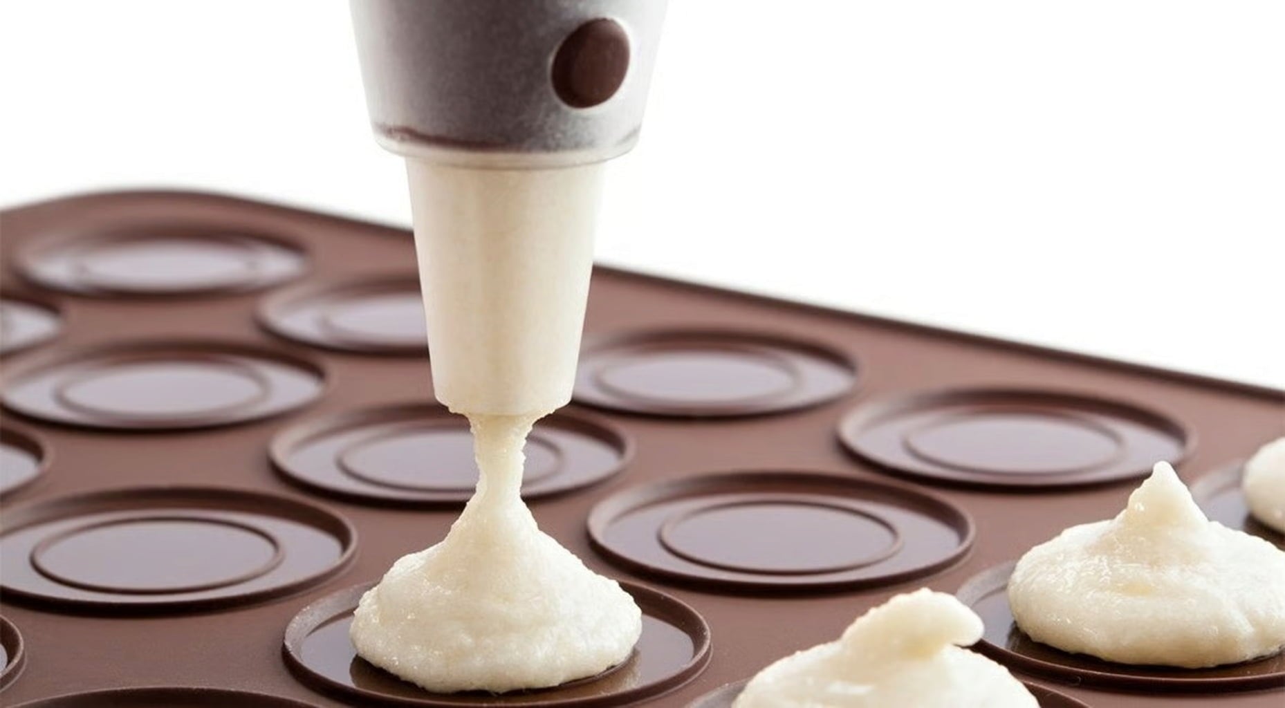 Sanjate o peki lastnih okusnih makronov, ki bodo vsakič popolni? S tem kompletom za peko makronov se te sanje uresničijo! Osrednji del kompleta je posebna podloga za peko makronov, izdelana iz 100% visokokakovostnega platinastega silikona. Priloženi Decomax s šestimi različnimi nastavki je vaš idealen partner za natančno nanašanje testa in umetniško polnjenje vaših kreacij.