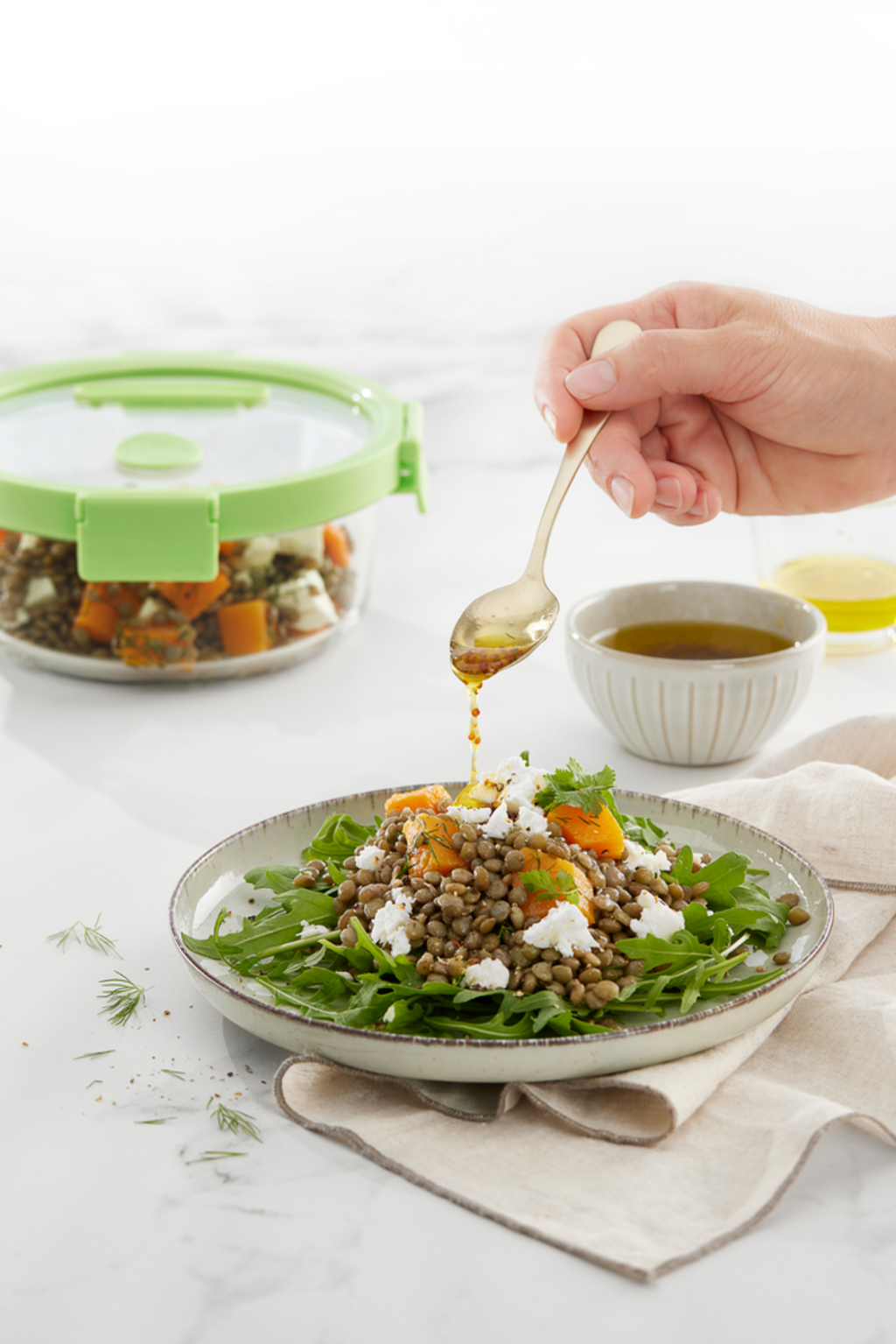 Zahvaljujoč toplotno odpornemu steklenemu pokrovu je posoda 100% nepredušna – tako se okusi čudovito ohranijo, neprijetne vonjave ali razbarvanje, ki so včasih povezani s plastičnimi pokrovi, pa nimajo nobene možnosti. Pametna odprtina v pokrovu vam omogoča celo segrevanje hrane neposredno v mikrovalovni pečici! In da vedno veste, kdaj ste kaj shranili, ima pokrov praktičen prostor za zapis datuma.