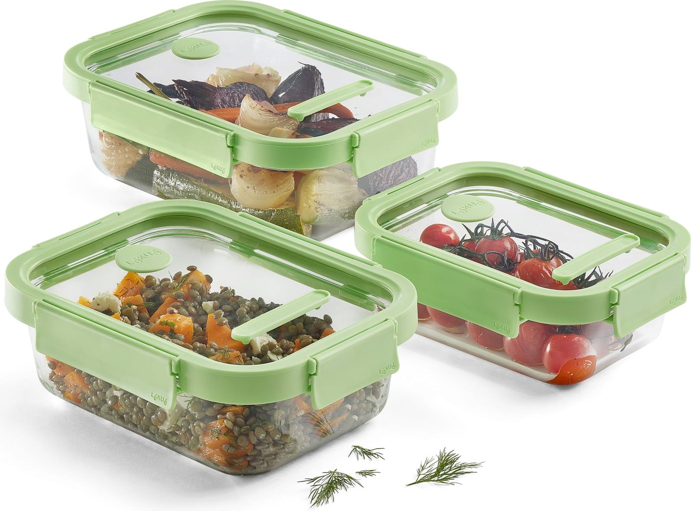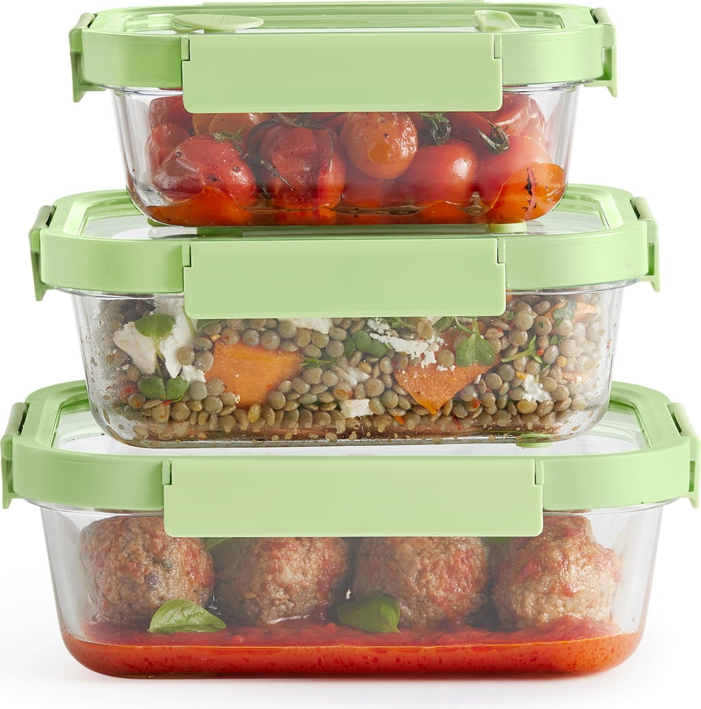 Te vsestranske, zložljive posode za živila so odlični pripomočki za varno shranjevanje hrane, načrtovanje obrokov in učinkovito preprečevanje zavržene hrane. Komplet vsebuje tri praktične velikosti (1520 ml, 1050 ml in 640 ml), tako da imate vedno pravo posodo za vsako količino. Izdelane iz robustnega borosilikatnega stekla, te posode niso le še posebej trpežne, ampak so tudi popolnoma nevtralne za okus in ohranjajo hrano svežo.