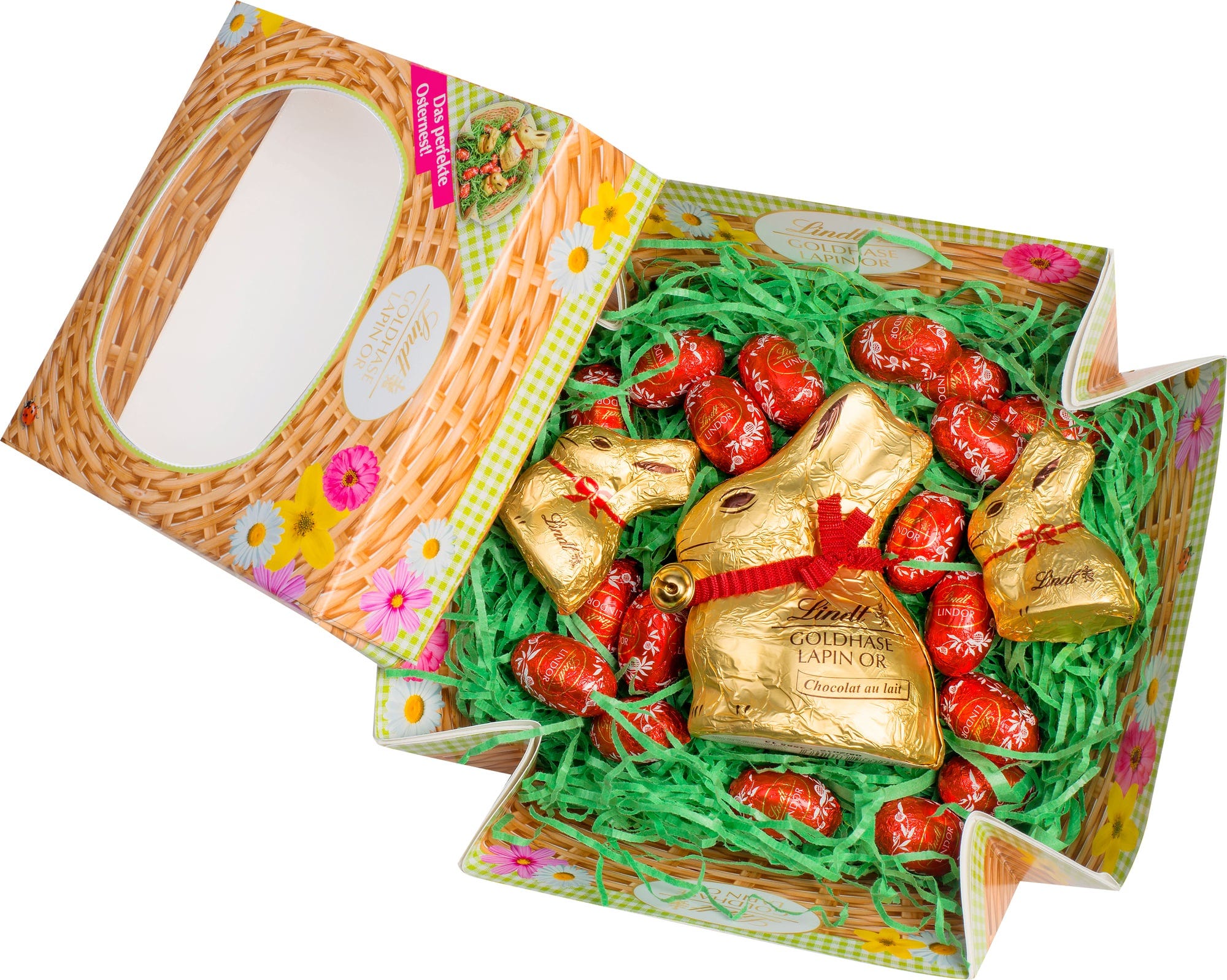 Ta ljubeče sestavljena velikonočna košara je odlično velikonočno darilo za vse ljubitelje sladkega in je prav tako okusna kot dekorativna. Tri čarobne Lindtove zajčice na bujni zeleni velikonočni travi in veliko okusno napolnjenih mlečnih čokoladnih jajc poskrbijo za praznično velikonočno razpoloženje v vsakem trenutku in ponujajo čokoladno uživanje na najvišji ravni.