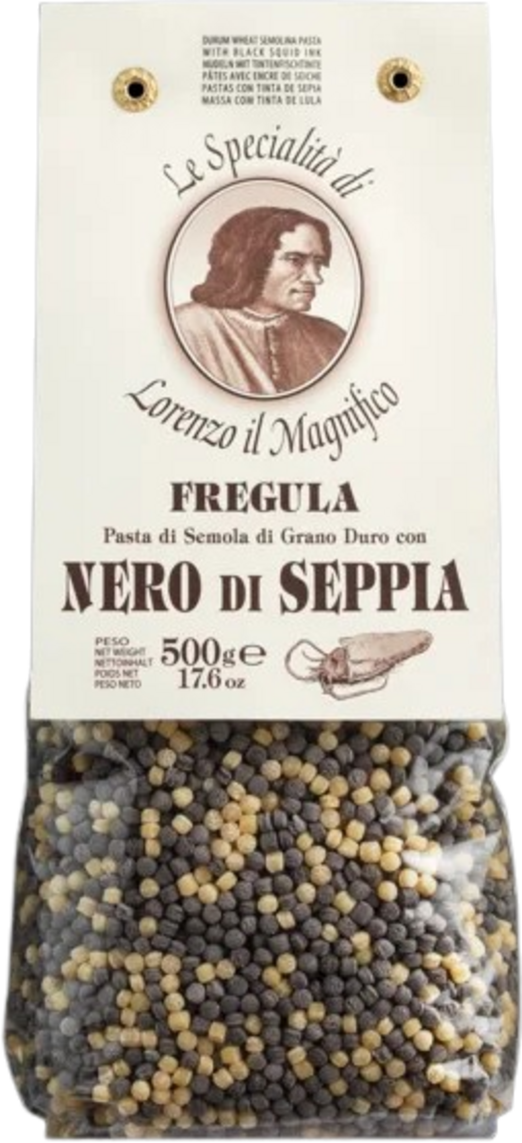 Odkrijte Fregola Nero di Sepia, vizualno in gastronomsko fascinantno testeninsko specialiteto. Te majhne, okrogle testeninske kroglice, narejene iz visokokakovostnega zdroba durum pšenice, so proizvedene po tradicionalnih metodah, nekatere kroglice pa so pobarvane v temno črno z 2 % lignjevega črnila.