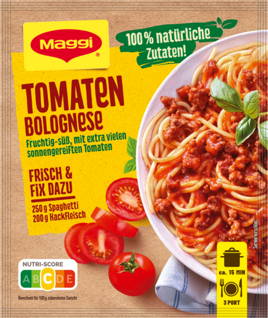 Z Maggi Fix - Tomato Bolognese lahko brez večjega truda pripravite to klasično italijansko jed iz testenin, polno sadnih okusov paradižnika. Skrbno uravnotežena mešanica začimb ustvari tipičen aromatičen okus bolonjske omake. Preprosto dodajte sveže sestavine, kot je mleto meso, in jed pripravite - hitro, enostavno in preprosto okusno.