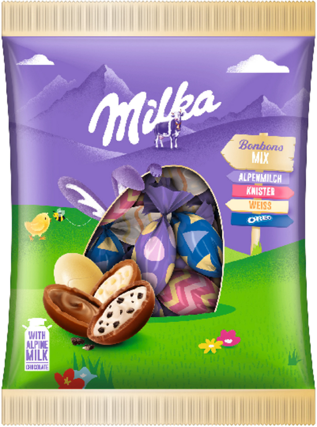 Milkina mešanica bonbonov ponuja raznoliko ponudbo slastnih, gladkih čokoladnih dobrot Milka – popolnih za velikonočne praznike. Vsak čokoladni bonbon ima bogat okus z izvrstnim pridihom Milka – doživetje, ki privabi tako otroke kot odrasle. Ta izbor alpske mlečne čokolade, čokolade Crackle, Oreo in bele čokolade obljublja prijetne trenutke prigrizkov na veliko noč.