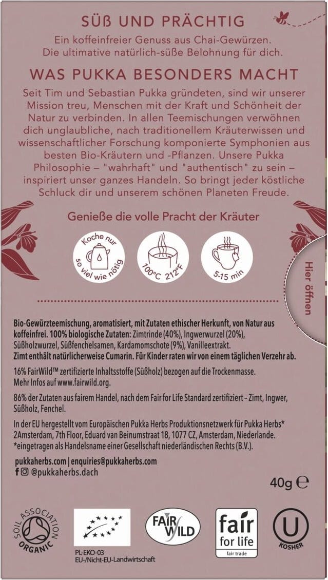 Ujemite se v toplem objemu zelišč, ki mešajo sladkobo z začimbami! Mešanica chai brez kofeina združuje kardamom in ingver s čudovitim bogastvom cimeta in vanilije. Tako ponuja simfonijo okusov, ki bo zapeljala vaše čute.