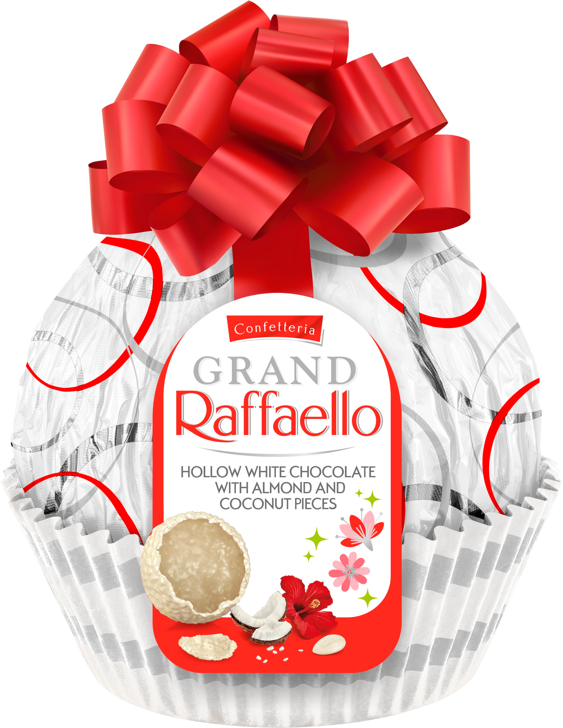 Z Grand Raffaello boste odkrili priljubljeno kokosovo klasiko v impresivnem, velikem formatu, ki takoj pritegne pogled. Uživajte v nežni lupini bele čokolade z okusom kokosa, ki jo obogatijo hrustljavi kokosovi kosmiči in nežni koščki mandljev. Praznična embalaža z velikim rdečim trakom ga naredi popolno darilo!