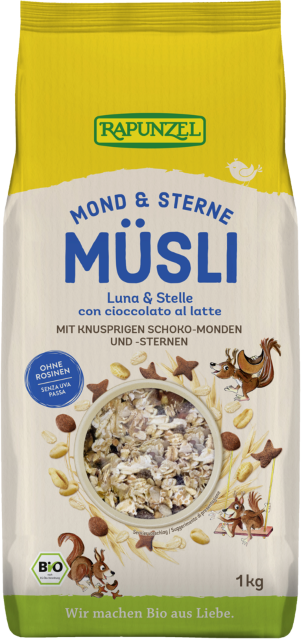 Moon & Stars muesli je sestavljen iz hrustljavih čokoladnih lun in zvezdic, hranljivih polnozrnatih žitnih kosmičev in okusnih mlečnih čokoladnih krispijev – okusen zajtrk za otroke in odrasle! Okusno tudi z dodanim svežim sadjem, jogurtom ali rastlinskimi mlečnimi nadomestki. Žito, uporabljeno v tem muesliju, je ekološko pridelano v Nemčiji.