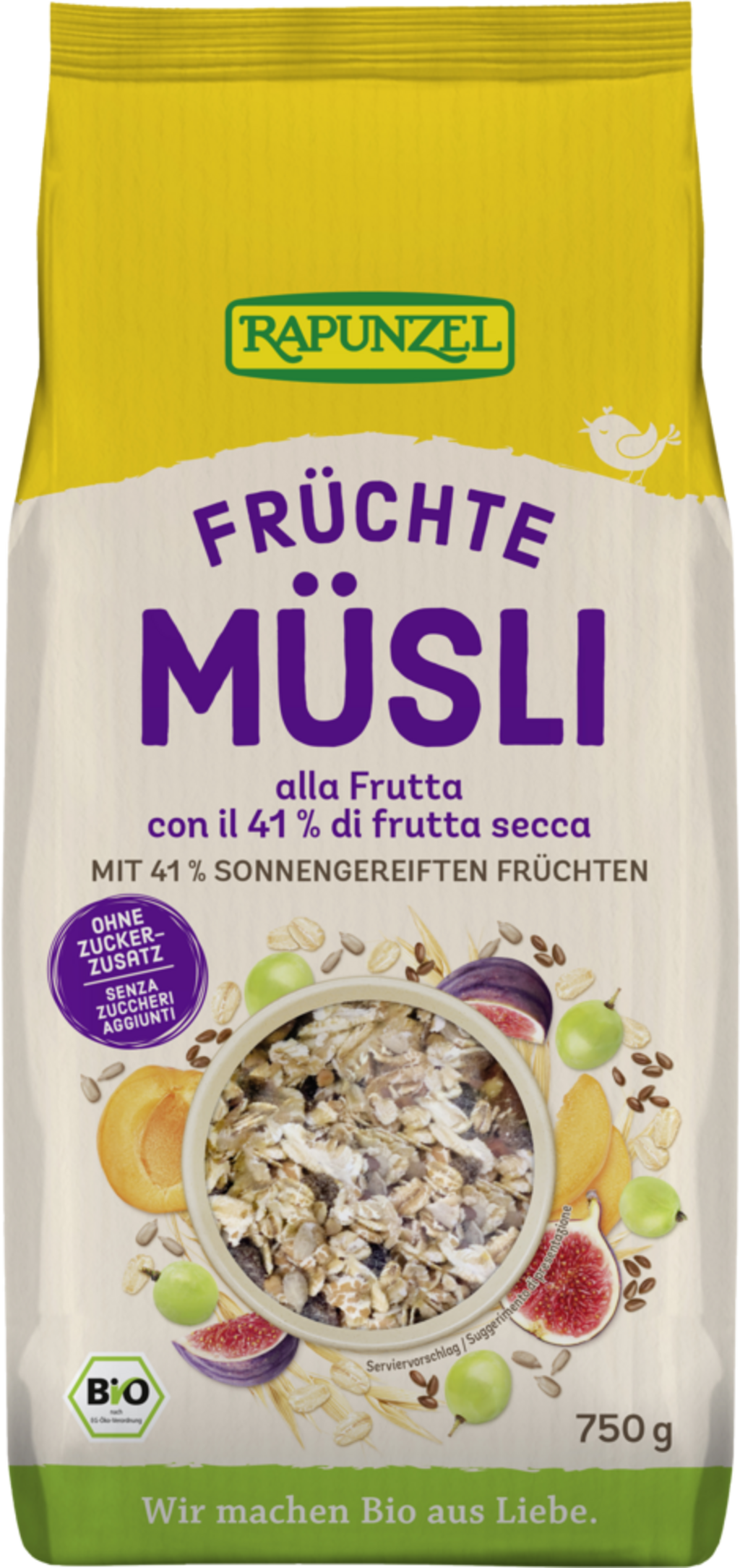 Ekološki sadni muesli Rapunzel z najmanj 40-odstotno vsebnostjo sadja poskrbi za posebej saden začetek dneva. Sadno-žitna mešanica muslijev ne vsebuje dodanega sladkorja, ker sladkost izvira le iz aromatičnih marelic, fig in sultana rozin.