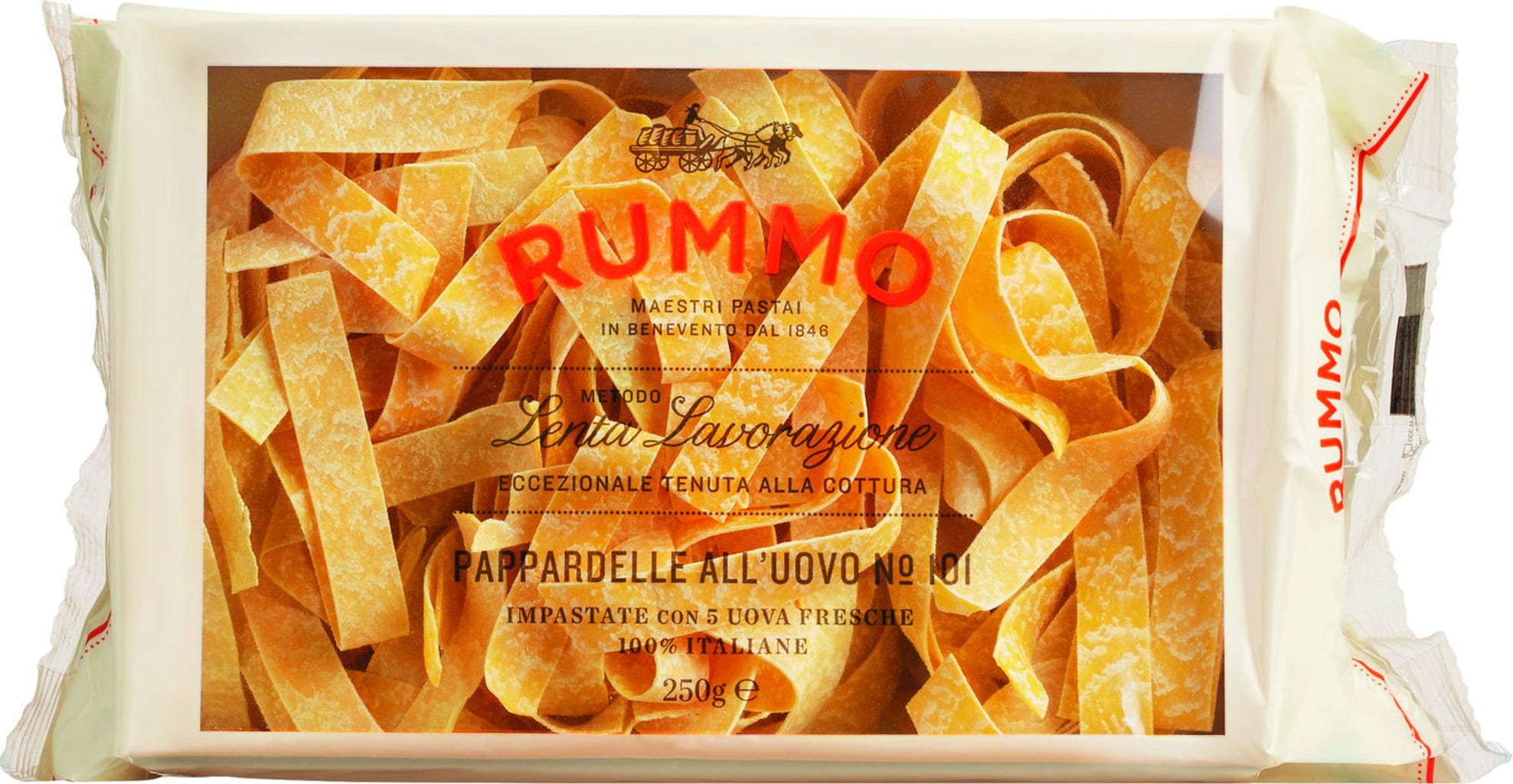 S Pappardelle N° 101 znamke Rummo v kuhinjo vnesete posebej impozantno testeninsko specialiteto! Ta širok format je idealna izbira za vse jedi, pri katerih je v igri veliko omake, saj velike površine mojstrsko vpijejo okus.