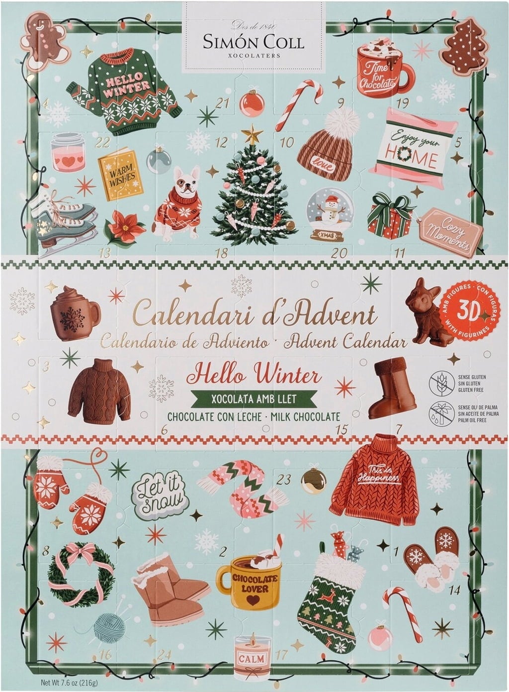 Zvezde, božična drevesca, medenjaki - adventni koledar Simón Coll vas bo presenetil s 24 igrivimi votlimi figurami! Nežna mlečna čokolada s 30% vsebnostjo kakava je primerna za sladokusce vseh starosti. Ljubeče ilustrirana zimska scena širi prijetno božično nostalgijo - idealno za razvajanje celotne družine.
