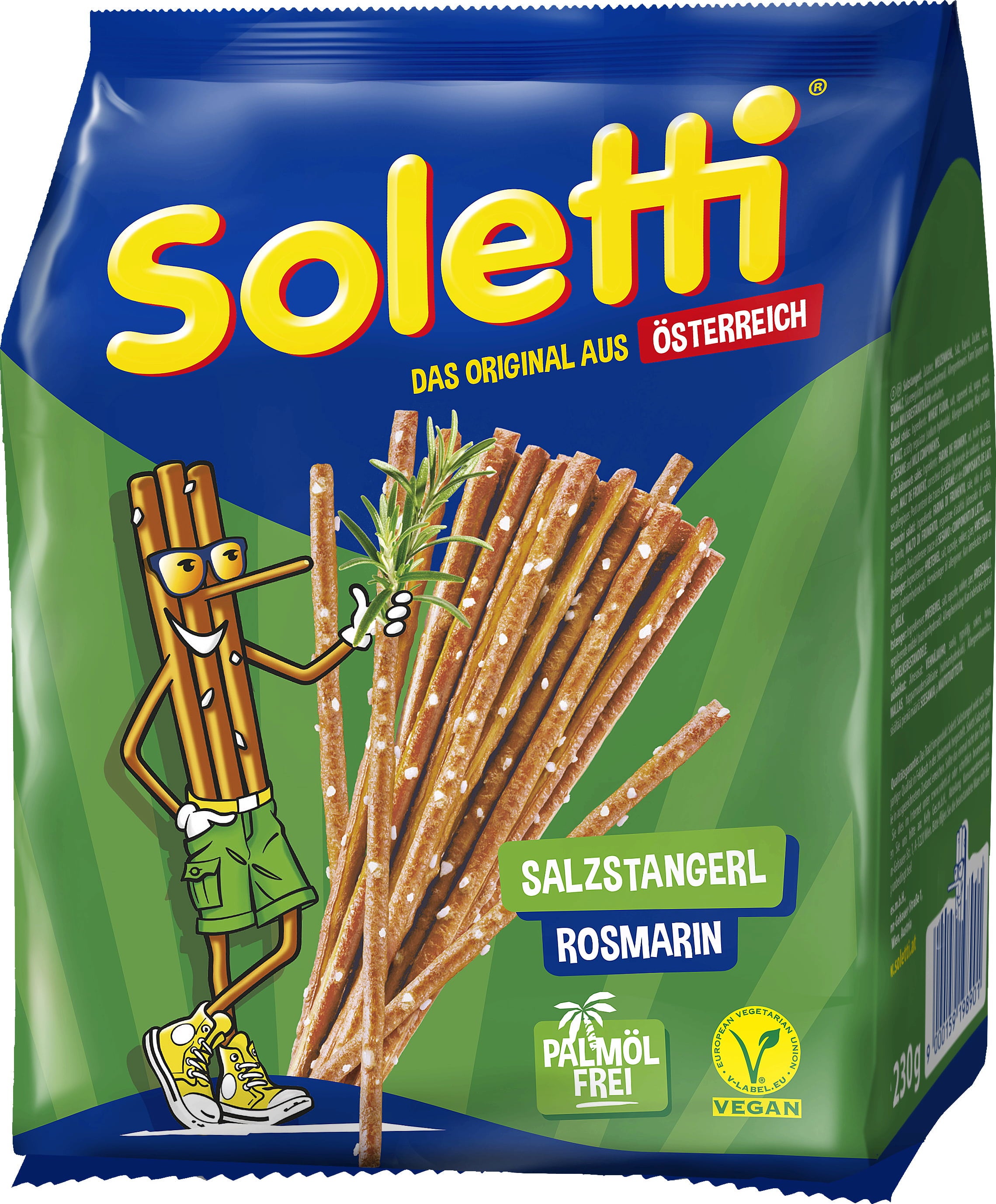 Te slane palčke Soletti so izdelane v Feldbachu iz avstrijskega žita in soli iz avstrijskih Alp. Veganski recept brez palmovega olja je obogaten z aromatičnim rožmarinom.