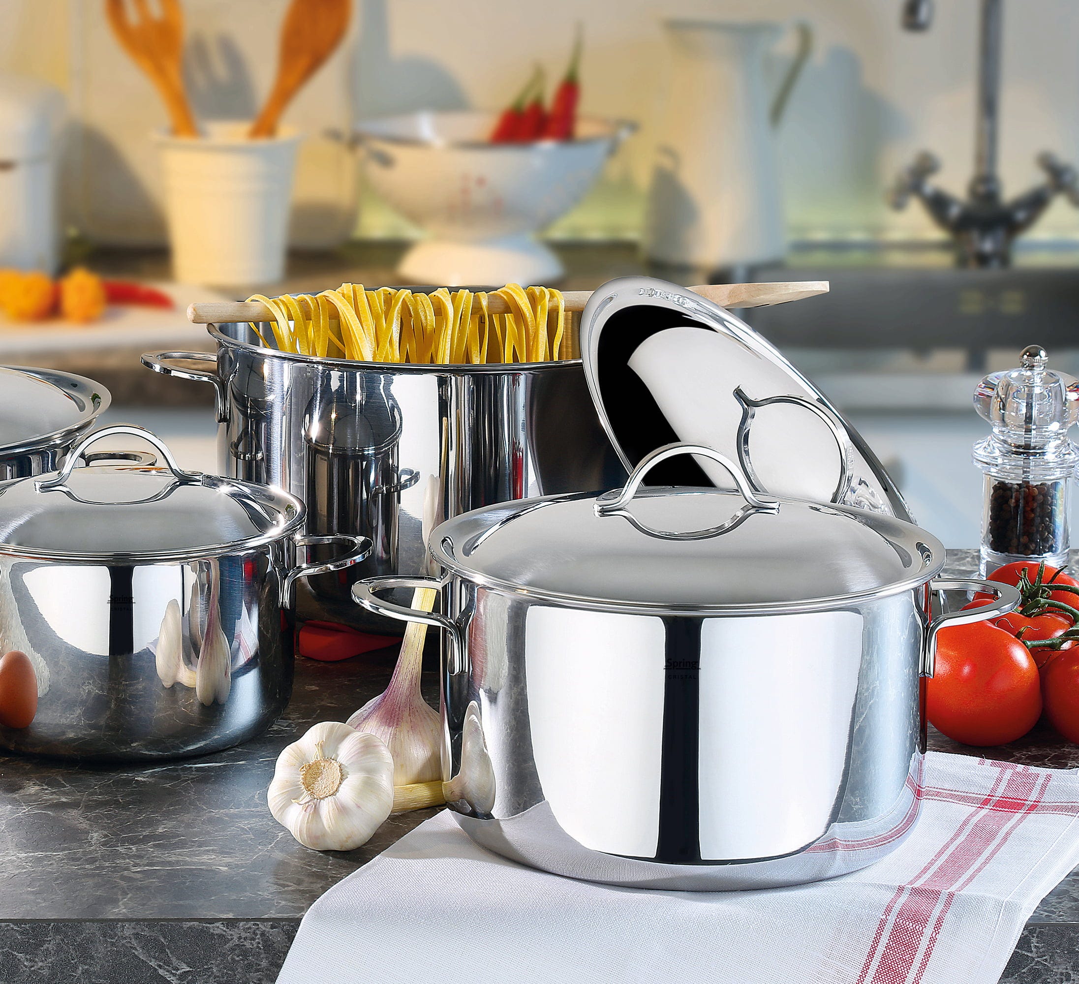 Serija Cristal je že več kot 25 let srce vsake zahtevne kuhinje. Njena posebnost: visokokakovosten 5-slojni večplastni material toplote ne zadržuje le na dnu, temveč jo neposredno prek sten prenaša v celotno vsebino posode. Rezultat je izjemno energetsko varčno, enakomerno in hitro segrevanje, pri katerem se optimalno ohranijo vitamini in sveže barve vaših sestavin.