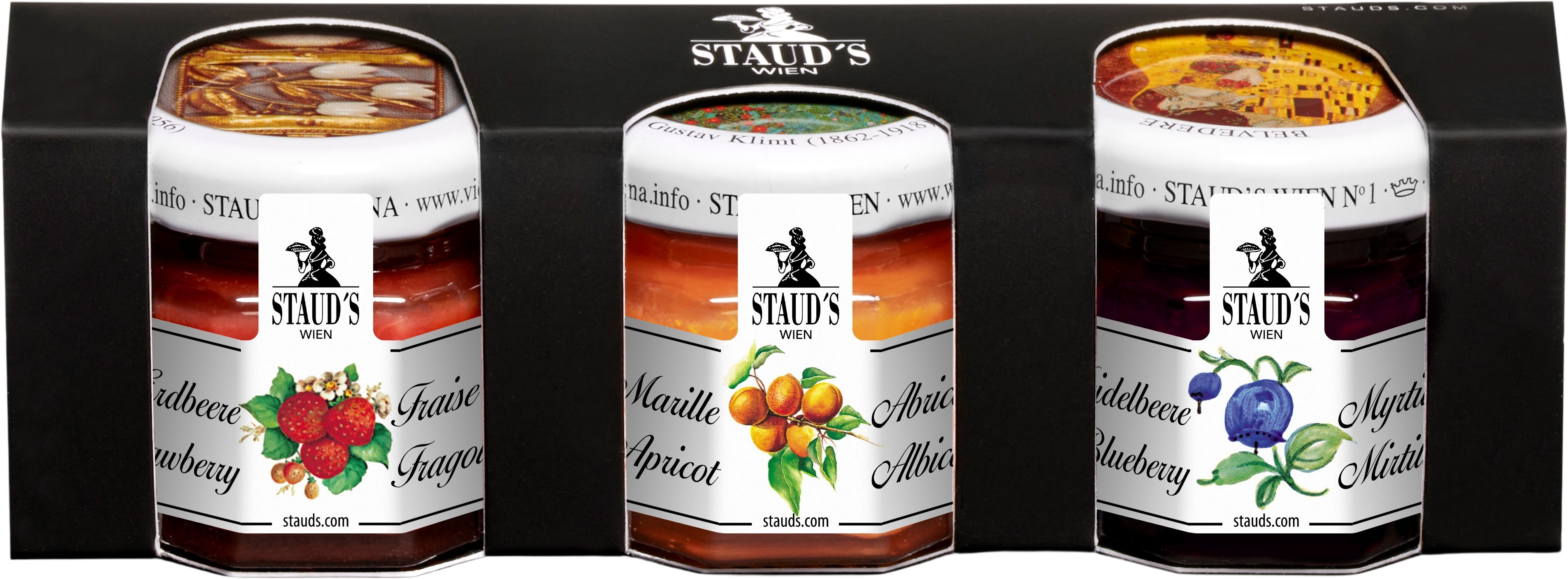 Elegantna črna škatla, ki vsebuje tri slastne STAUD'S namaze v kozarcu, posvečenem dunajski umetnosti: borovničev, marelični in jagodni namaz. Popolno kot darilo za sladokusce.