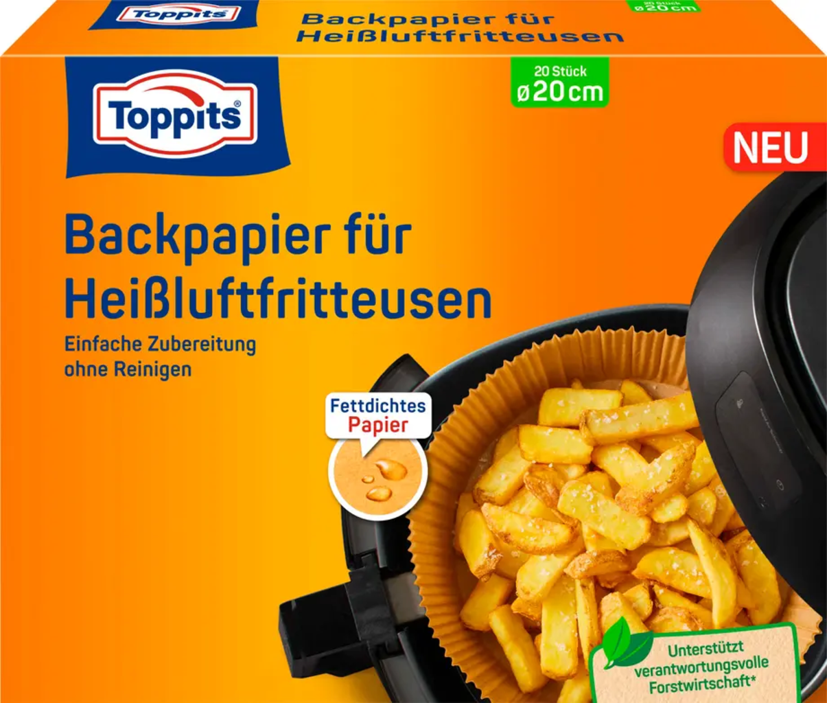 Papir za peko Toppits za cvrtnike na vroč zrak je posebej zasnovan za lažjo pripravo prigrizkov in obrokov v cvrtniku na vroč zrak. Premaz proti prijemanju preprečuje, da bi se hrana prijela papirja. Cvrtnik na vroč zrak ostane tudi čistejši, saj brizgi in ostanki pristanejo neposredno na papirju. Material, odporen proti maščobi, preprečuje tudi pronicanje maščobe na dno cvrtnika.