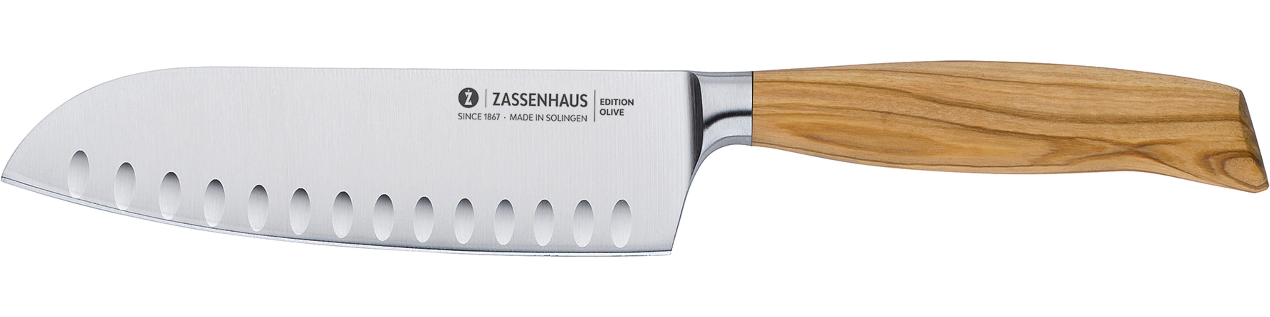 Santoku nož EDITION OLIVE znamke Zassenhaus je vsestranski nož za meso, ribe in zelenjavo. Ročno kovano rezilo iz visokokakovostnega posebnega jekla ostane ostro dolgo časa in brez napora drsi skozi katero koli sestavino. Ergonomski ročaj iz oljčnega lesa se odlično prilega roki in zagotavlja delo brez utrujenosti. Praktične vdolbine preprečujejo prijemanje hrane na rezilo – idealno za natančno rezanje in sekljanje v kuhinji.