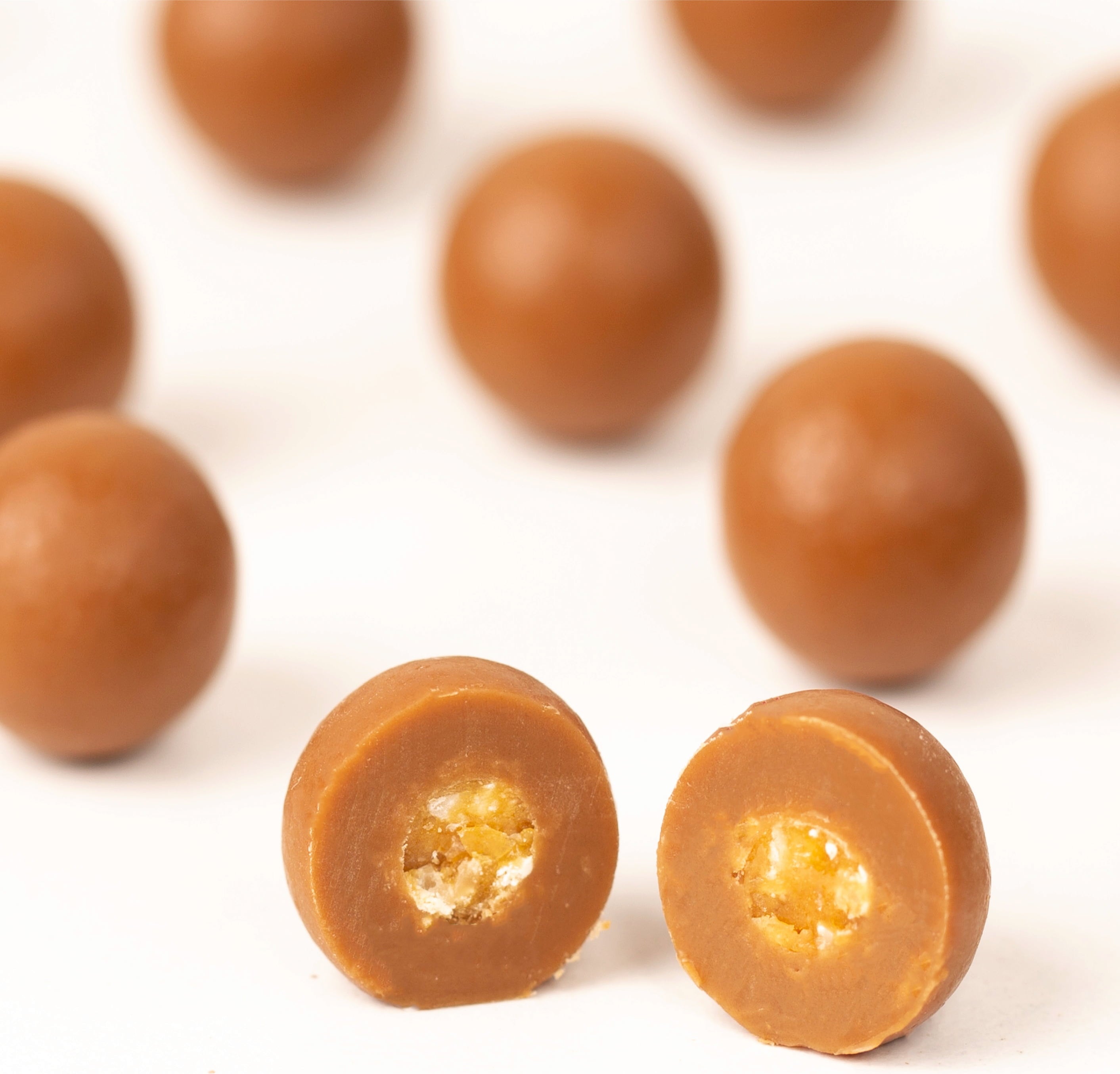 Te majhne kroglice imajo vse: hrustljavo mandljevo krokantno kroglico v notranjosti in nežno topljivo, sladko karamelno čokolado na zunanji strani. Rezultat so pravi biseri užitka, ki so prav tako odlični za prigrizek kot za darilo.