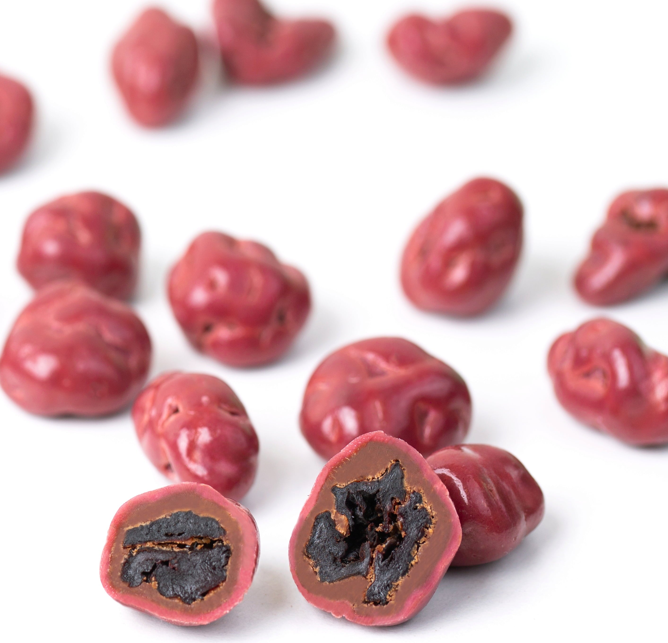 To okusno sadje je obdano z dvema slojema čokolade: Najprej so višnje pomočene v stopljeno mlečno čokolado z impresivno 50% vsebnostjo kakava. Končni vrhunec je sijoča prevleka iz sadnega rdečega višnjevega preliva. Fantastično rdečo barvo povsem naravno in pristno ustvarijo same višnje. Rezultat? Edinstvena poslastica, ki vas bo z vsakim grižljajem nasmejala.