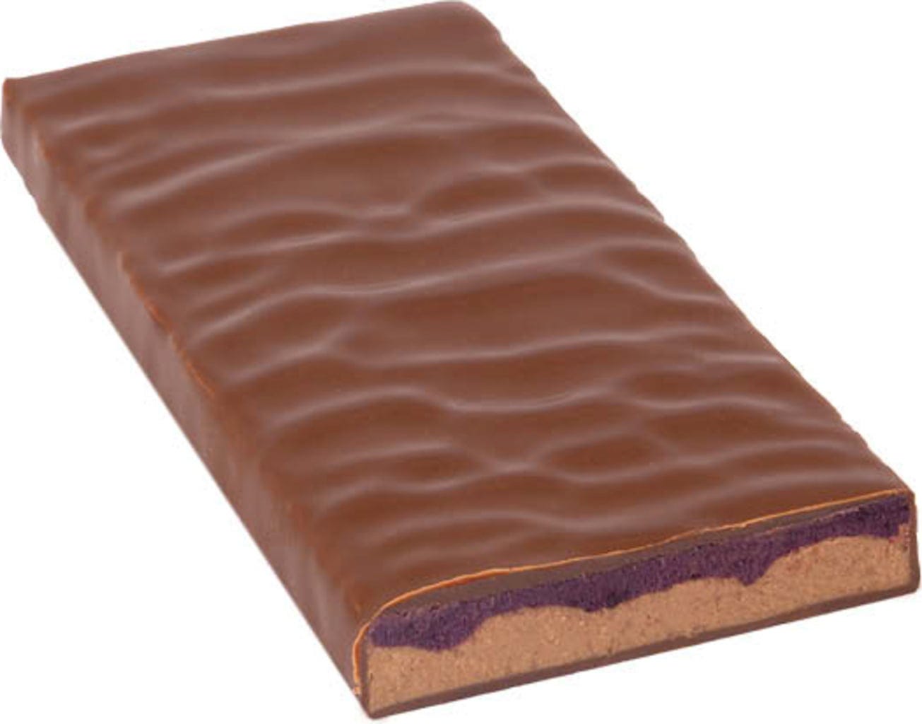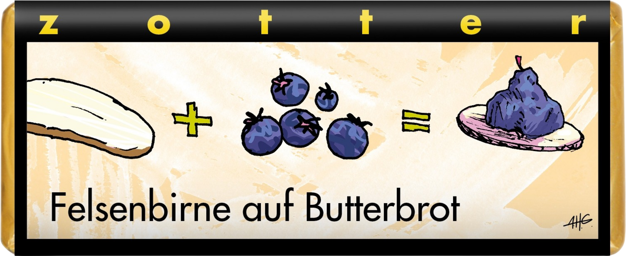 Ta polnjena ploščica, prelita s fino temno mlečno čokolado s 50 % kakava, slavi aromatično hruško. Hrušica po okusu in videzu spominja na borovnice, z rahlim pridihom marcipana. Zotter uporablja ta okus za intenziven sadni ganache, ki jo zaokrožuje bela čokolada in ščepec limone.
