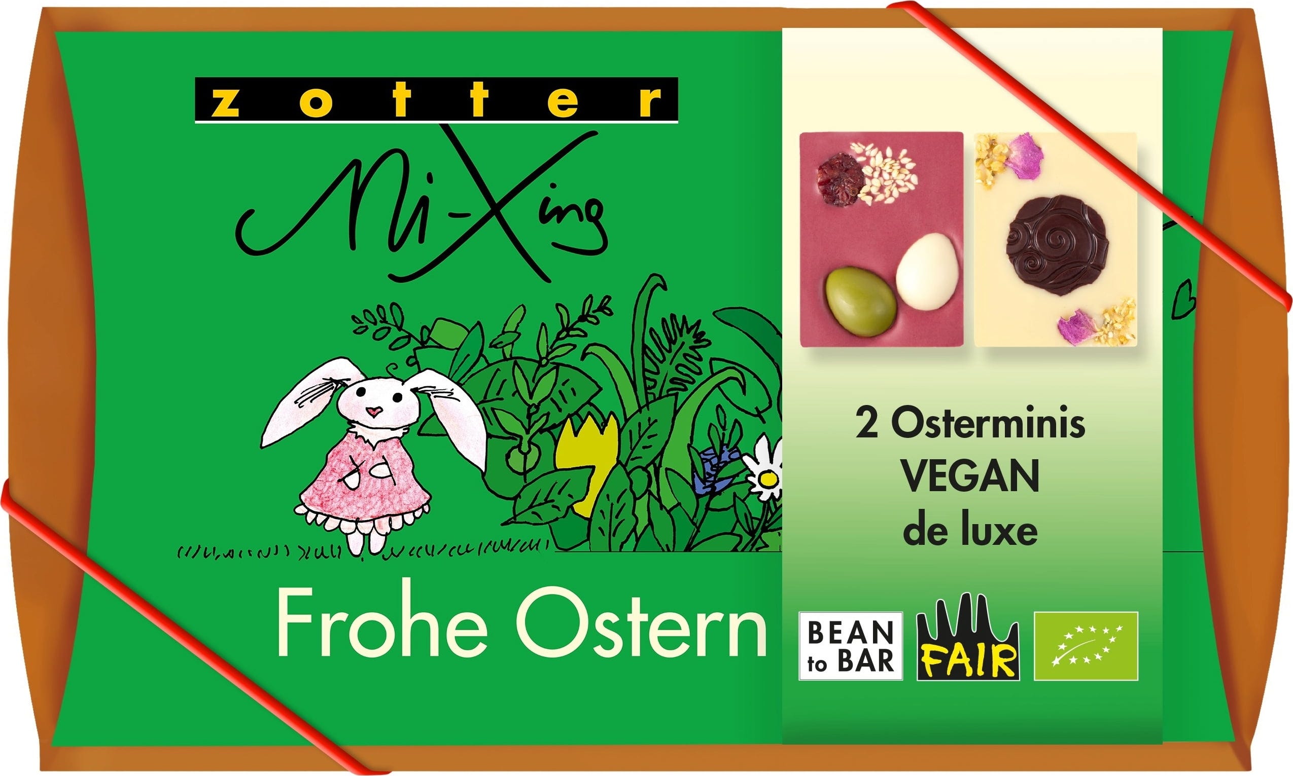 Ta veganski darilni set MiXing Easter Minis de Luxe znamke Zotter vsebuje dve ljubeče oblikovani mini čokoladici. V dekorativni embalaži boste našli sadno in aromatično čokoladico z okusom maline in kokosa ter belo kokosovo čokoladico, polnjeno s hrustljavimi lešnikovimi krokanti – obe umetniško okrašeni in barvito predstavljeni.