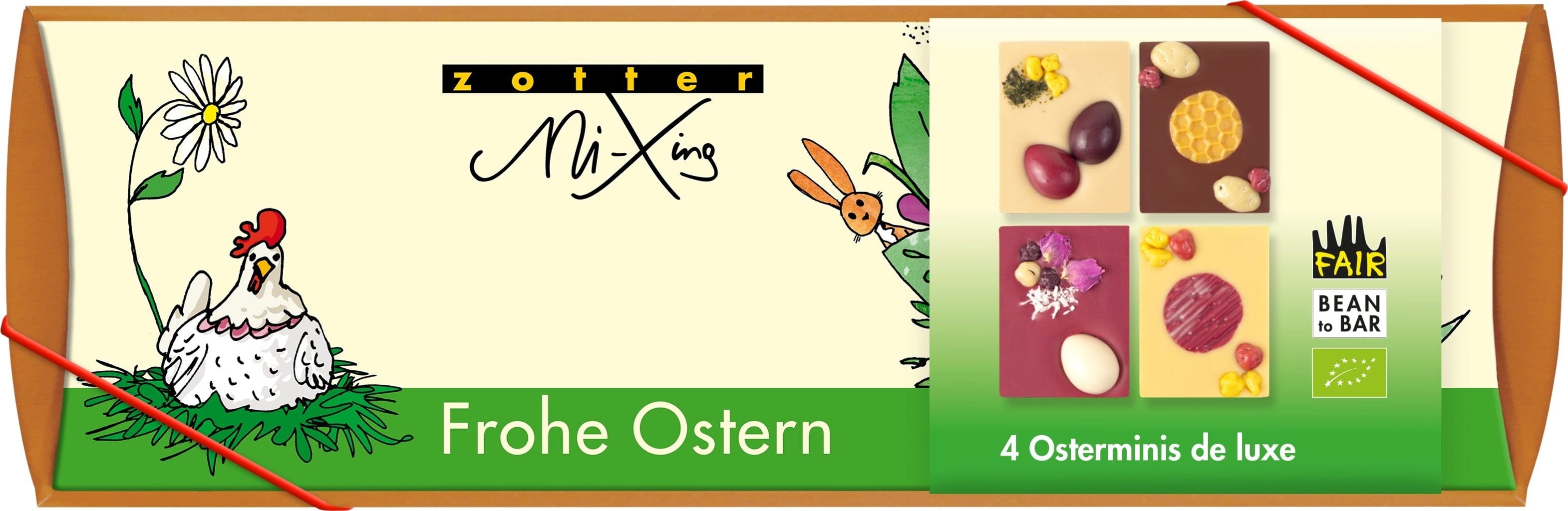 Zotterjeve velikonočne mini čokoladice de Luxe ponujajo izvrstno oblikovane mini čokoladice, ki obljubljajo posebne trenutke razvajanja v velikonočnem času. Vsaka čokoladica združuje visokokakovostne bio sestavine in ročno izdelavo, kar ima za posledico značilne okuse in nežne teksture. Lepo oblikovana embalaža naredi ta čokoladni set elegantno darilo.