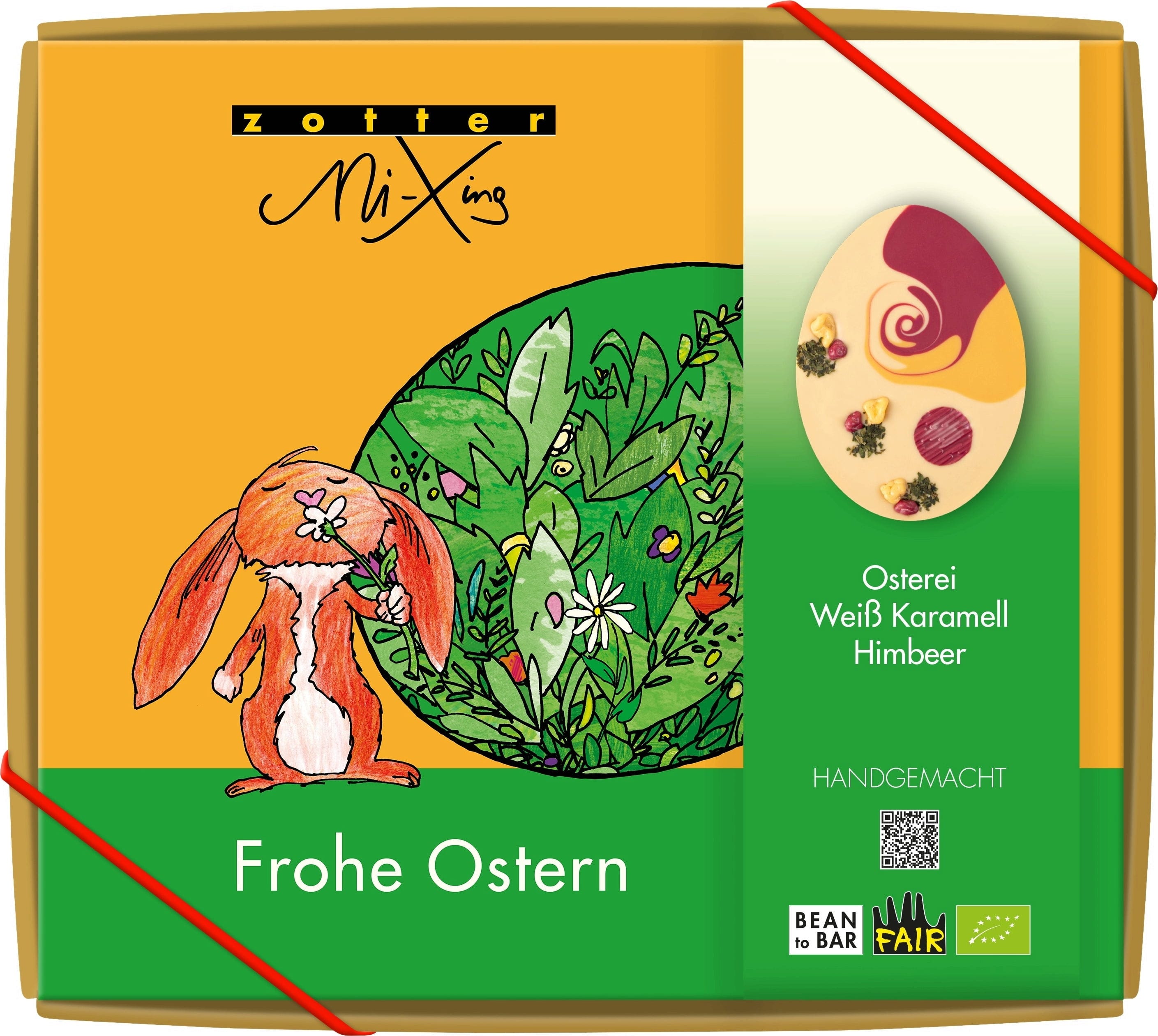 Izkušnenj v jeziku slovenščina za izdelek Zotter Schokoladen Bio MiXing velikonočno jajce - bela čokolada-karamela-malina