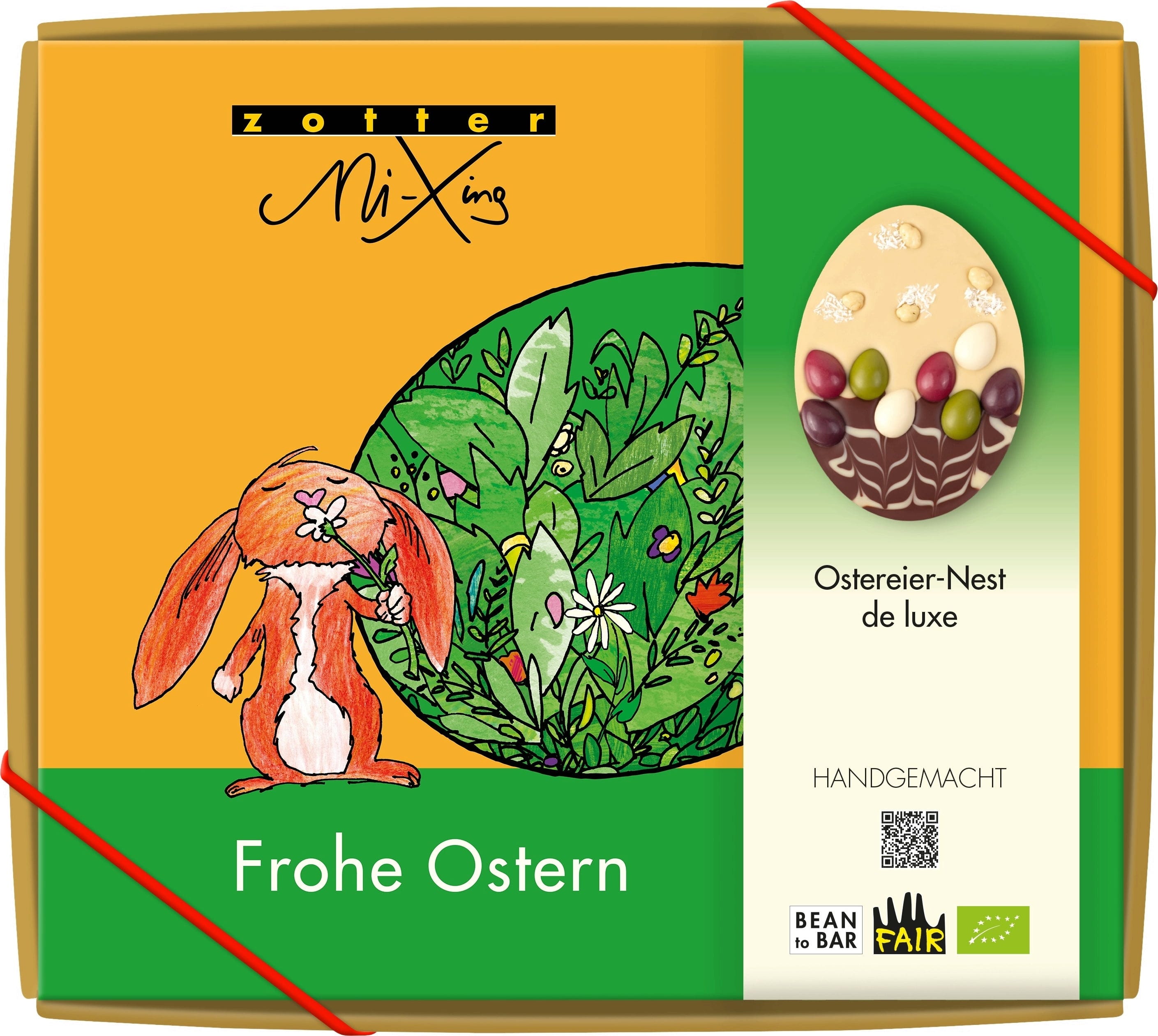 Zotterjev "Easter Egg Nest de Luxe" je ročno izdelana, umetniško oblikovana čokoladica iz bele in mlečne čokolade, okrašena z vzorcem košarice, ki združuje več majhnih čokoladnih velikonočnih jajc v obliki dekorativnega gnezda. Majhna čokoladna jajca so narejena iz različnih kuvertur, katerih barve izvirajo izključno iz pravih sestavin.