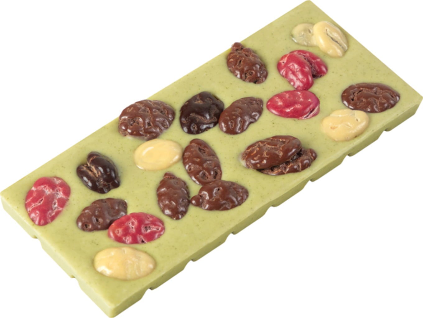 Bi radi uživali v koščku štajerske barve? Ta ploščica je sladek, barvit in štajerski vrhunec, ki počiva na beli čokoladni podlagi, naravno "ozelenjeni" s kremastim zelenim nugatom iz bučnih semen.